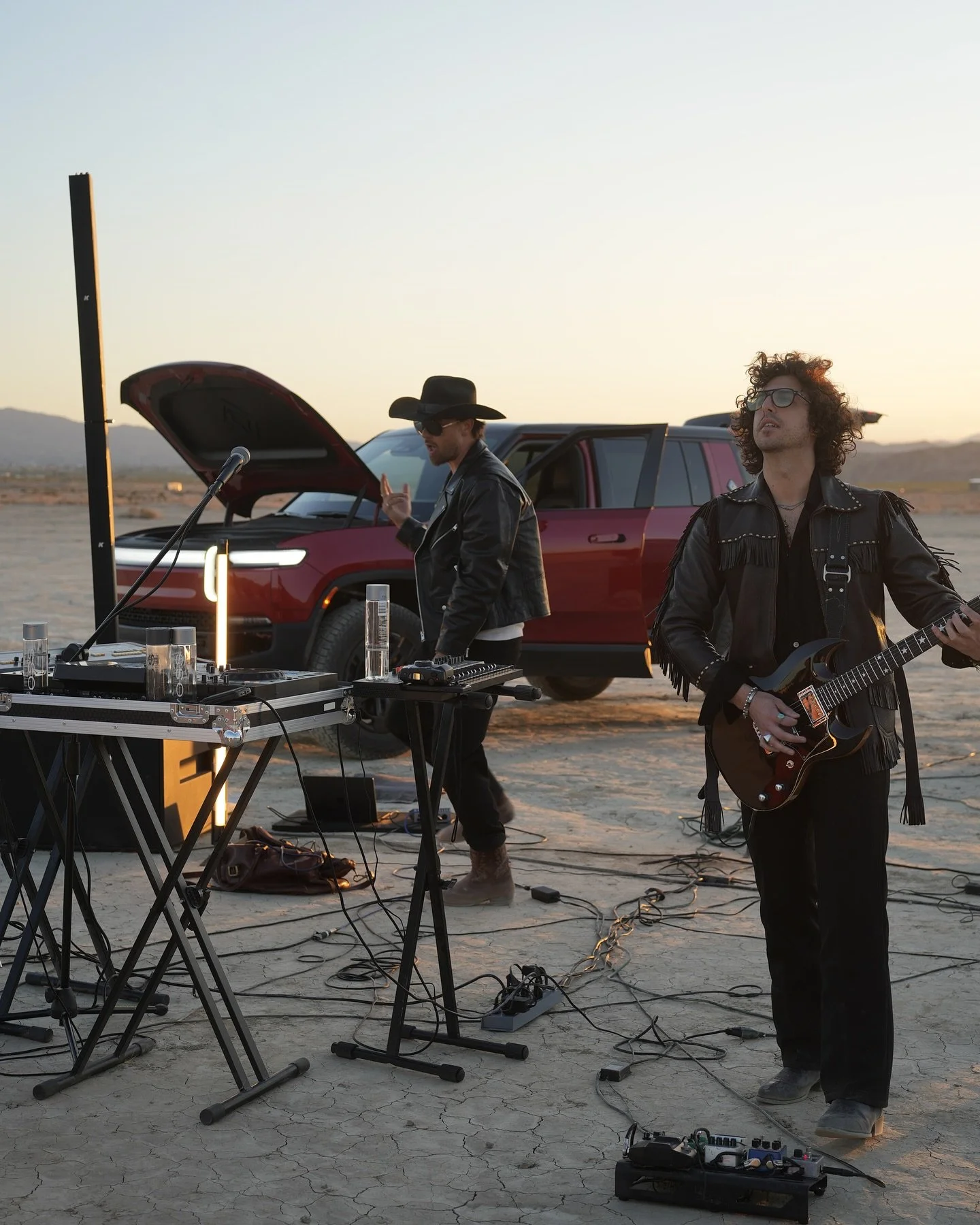 Following their Coachella performance, electronic duo Mojave Grey brought their signature desert dance sound to an intimate sunset gathering near Joshua Tree National Park on April 15th. Set in a remote location, the event was invitation only and fully off-grid, powered entirely by Rivian electric vehicles and sponsored by VOSS Water.